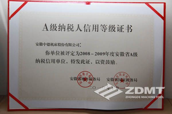 中德機床榮獲“2008-2009年度安徽省A級納稅信用單位”榮譽稱號
